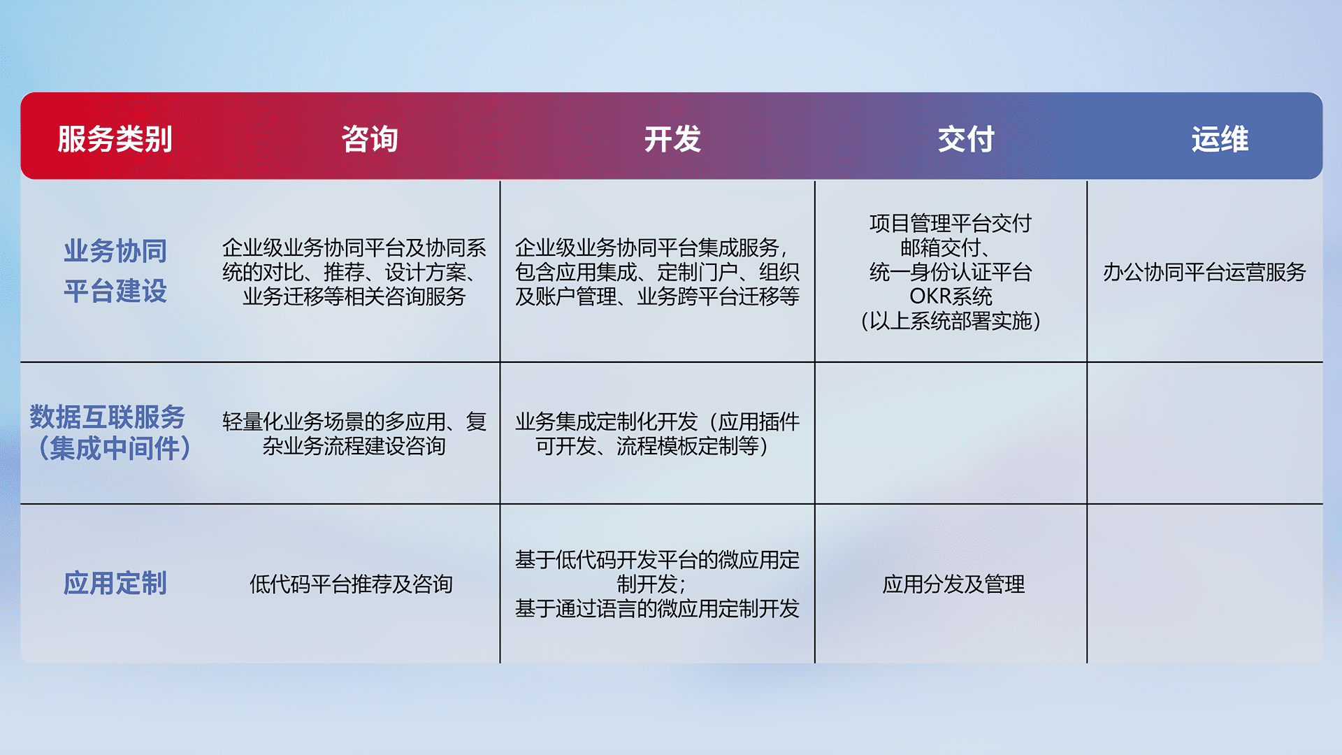针对钉钉、、、、企微、、IDaas等平台级产品提供产品的规划、、方案、、、交付、、、定制化开发等服务,,实现如统一协同办公、、智能客户服务、、混合会议管理、、、智能数据查询、、、等业务场景,,,实现数字化转型。。。。