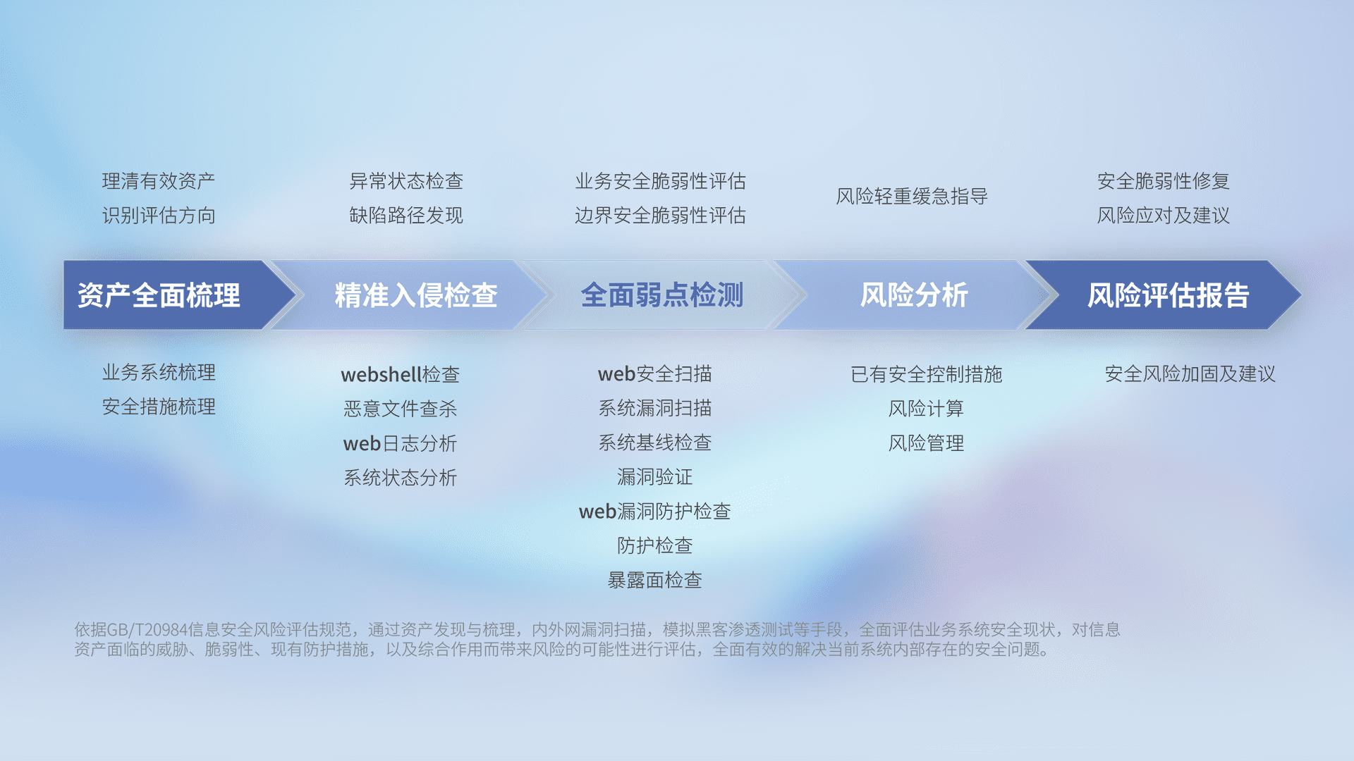 针对客户行业特性,,以专业的安全服务+多厂商联合解决方案提供专属的一站式安全管理服务,,,,帮助客户全面感知网络空间威胁,,基于识别、、、检测、、、分析、、、、防护、、、监测、、响应的服务理论模型,,从方案咨询、、集成交付、、评估验证、、优化加固、、、、运维运营,,致力于为客户提供完整的闭环管理式安全服务。。。。以实战经验为客户打造高抵御风险的安全体系,,,,帮助客户发现威胁、、、、对抗威胁、、、处置威胁,,不断积累安全对抗能力,,,,持续保障数字化安全。。。。